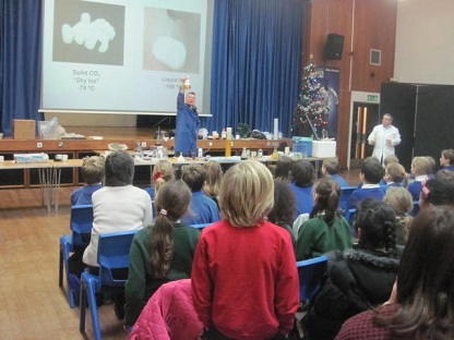 In late 2013, Dr. Jason Lynam and Professor Ian Fairlamb delivered four Christmas Demonstration Lectures at Wetherby High School. The first was delivered to year 10 students (ca. 150), with typical demonstrations included: 1) pH changes using universal indicator and solid carbon dioxide / addition of sodium bicarbonate to red cabbage water; 2) production of hydrogen from graphite pencils in water using a 9 volt PP3 battery; 3) degradation of hydrogen peroxide using fresh liver to give molecular oxygen, which was then reacted on with toluene in a balloon; 4) the Christmas dinner digestion with hydrochloric acid; 5) ice-cream making using both ice/NaCl and liquid nitrogen. The demonstration that received the most interest was the liquid nitrogen frozen orange slice, which quickly turned to an orange power at -196 °C (under controlled conditions). Similar demonstrations were shown to the primary school children (aged 9-10), in three lectures, where there was direct participation in the solids, liquids and gases demonstration.