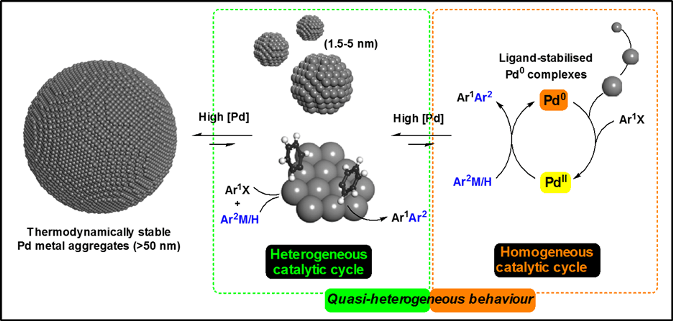 We are interested in how small, catalytically competent Pd nanoparticles form under cross-coupling reaction conditions. We have gathered evidence showing that such species play a key role in many different types of reactions, including C-H bond functionalisation reactions.