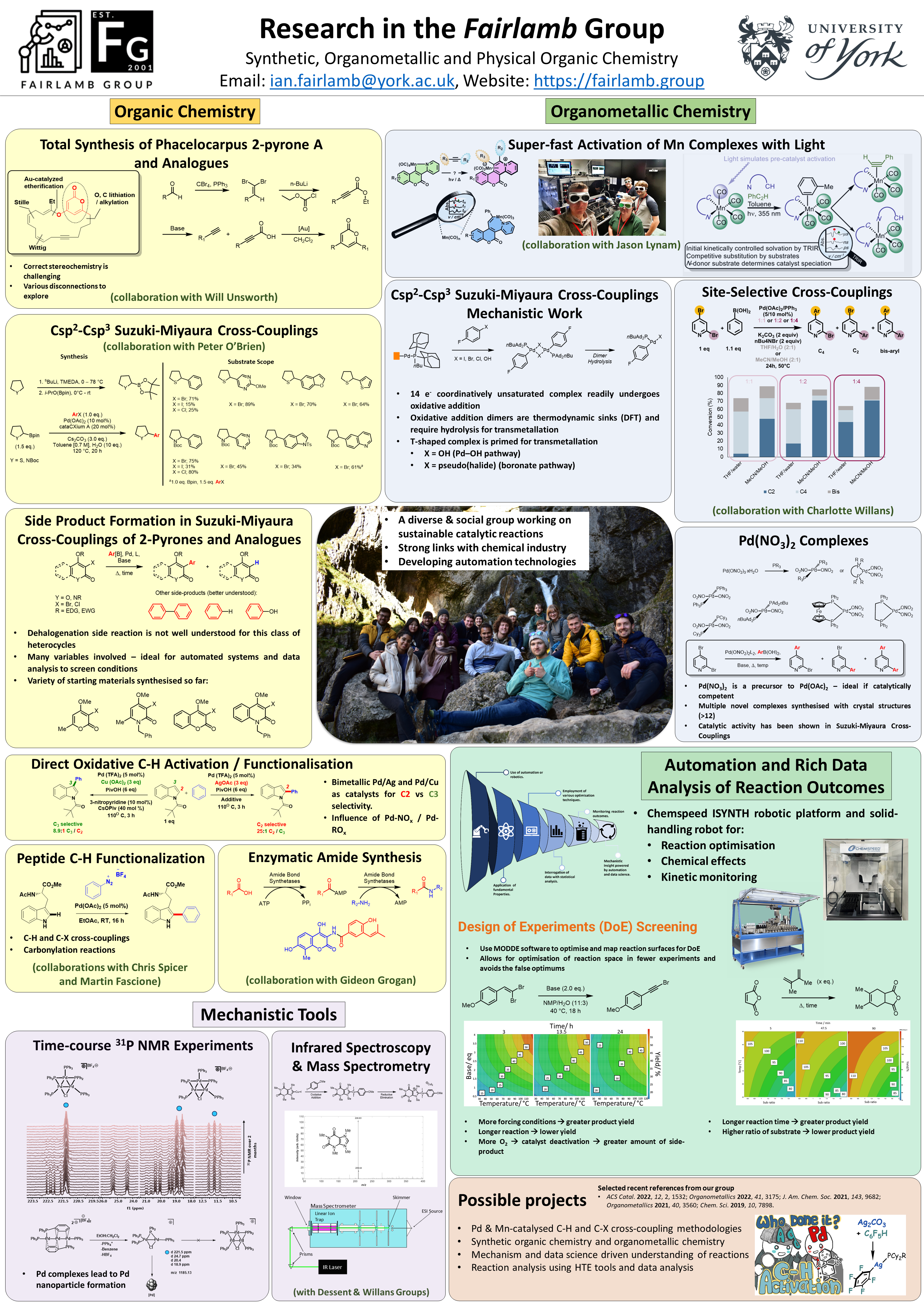 The above poster outlines all the work the Fairlamb group conducts, including work with other Academics which Prof. Fairlamb co-supervises/co-manages. The Fairlamb group researches organic chemistry: Side Product Formation in Suzuki-Miyaura Cross-Couplings of 2-Pyrones and Analogues and Direct Oxidative C-H Activation / Functionalisations. More organic chemistry projects involve Dr. Will Unsworth looking at the total synthesis of Phacelocarpus 2-pyrone A and analogues and Prof. Peter O’Brien researching the synthesis of various boronic acid analogues used during Csp²-Csp³ Suzuki-Miyaura cross-couplings and applying to large substrate scopes. Further research projects in bio-organic chemistry field with Prof. Gideon Grogan look at peptide C-H functionalisation, and Dr. Chris Spicer, and Dr Martin Fascione with enzymatic amide synthesis.